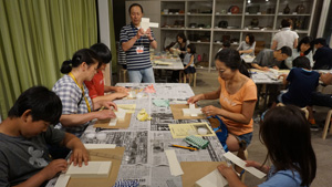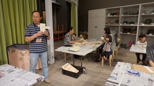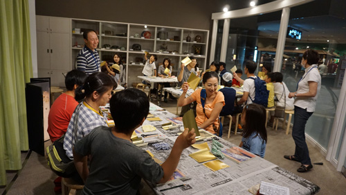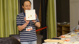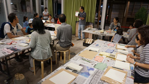 そして、この日ミュージアム・ラボでは、片岡恭一さんによる「からくり屏風をつくってみよう」というワークショップを行いました。片岡さんが丁寧に説明されて、屏風の基礎つくりが着々と行われていきます。