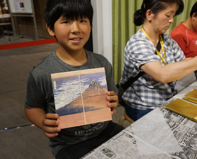 屏風の形が完成したら、からくり屏風の4面のうち1面に北斎の赤富士を貼ります。昔ながらのお米からつくるヤマトノリは、とくに夏場は管理が悪いとすぐかびてしまうので、管理がたいへんだそうです。