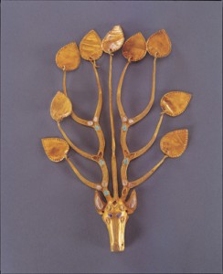 第1章では、チンギス・ハーンが登場する以前の騎馬遊牧民族の東胡族・匈奴族・鮮卑族・突厥族・契丹族の五部族の装飾品を中心とした出土品67点を展示します。