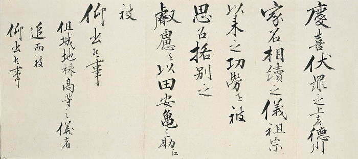 戊辰戦争に敗れた德川宗家は存亡の危機におちいりました。しかし、誕生して間もない明治新政府にとって、内政を安定させ全国統治を図るためには、徳川家名相続を認め、その跡継ぎを決定することが必要でした。松平確堂(斉民)による後見を得て、德川宗家第16代当主となったのは、当時6歳の田安亀之助―のちの徳川家達です。駿河府中藩70万石の当主として静岡に移った家達のもとで、德川宗家の新たな時代が始まりました。