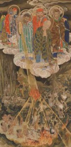 生前に犯した罪によって熱地獄へ落ち、煮えたぎる釜の中で 苦しむ人々。そこへ羅漢たちが現れ、錫杖(しゃくじょう)で 罪人を救おうとする。