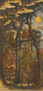 マングローブのように根を伸ばしたエキゾティックな樹木の下、「露地」すなわち野外で修行する羅漢たち。鈍く輝く満月が、いっそう不気味さを助長している。