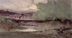 平安朝の御所車と従者、それを見送 る子守を描いた雅な作品。日本的な画題を西欧の油彩画法で描く。清雄はパリ留学時に晩年のコローを訪ねたという。滴るような緑と水の表現は、コローに感化 されたものかもしれない。なおこの作品を制作中に、日本画家の橋本雅邦と知己を得、日本美術院の画家たちとも交友することとなった。