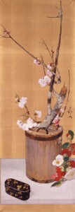 花器に見立てた古い釣瓶に梅、桜、桃を投げ入れ、椿を添える。「芳春四妍」と題され、昭和2年(1927)の全作品展に出品されたと思われる作品。春を代表する4つの花が妍(けん)を競い合う、迎春の華やかな作品。