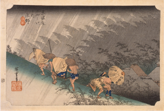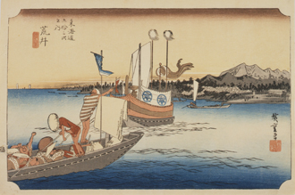 「東海道五拾三次」は、東海道の53の宿場をテーマに、出発地点である江戸の日本橋と、到着地点の京都の三條大橋を加えた、全部で55枚揃いの風景画です。東海道を描いた浮世絵版画は、たくさん出版されましたが、なかでも1833年(天保4)に版行が始まったこのシリーズは、最も完成度が高く人気があったものです。今回は、この中から主要な18点を展示します。