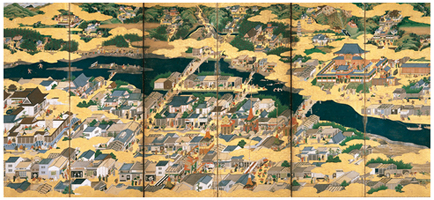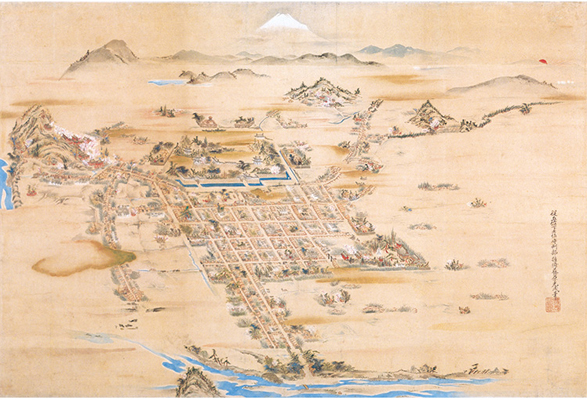 この章では、とりわけ重要であった江戸城をはじめ駿府城、名古屋城、大坂城、二条城などに関連する屏風、城郭図、絵地図などを紹介します。
