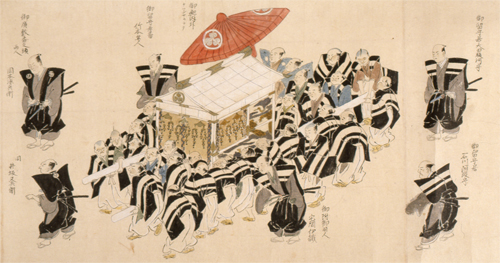 将軍家の正室(御台所)は、3代家光以降、宮家や五摂家から迎えるのが慣例で、京都から江戸に行列を組み婚礼道具を携えて下向してきました。一方で、将軍家の姫君が嫁ぐ際には、蓬莱模様を施した白絵の輿に乗り、江戸城から行列を組んで嫁ぎ先の大名の江戸藩邸に入輿しました。本章では、下向絵巻や婚礼行列絵巻を読み解きながら、徳川将軍家の婚礼について紹介いたします。