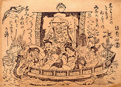 初夢は江戸時代の後期、正月二日の夜に見る夢が定説となりました。良い初夢を見るためには、枕の下に宝船の絵を敷くとよい、とされ、正月の江戸の町には、「おたから、おたから」の売り声とともに宝船の絵を売り歩く「宝船売り」が現れ、お正月の風物となりました。