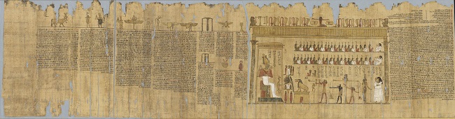 死者は、墓地の守護神でミイラ作りの神でもある山犬頭をしたアヌビスにより、「二つのマアト(正義)の広間」に導かれます。ここで死者の審判が行われ、死者の心臓は天秤ばかりにかけられ、マアトを象徴する羽根と釣り合うか計られました。古代エジプト人は考えたり思ったりする器官は脳ではなく心臓だと考えており、心臓の役割は重要でした。