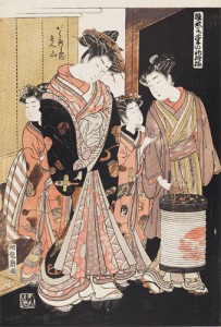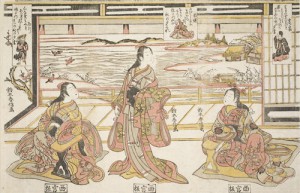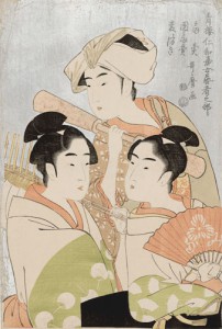 1765年(明和2)頃には、裕福な好事家(こうずか)の間で絵暦(えごよみ)交換会が大流行します。少しでも色数の多い版画制作を目指した結果、豪華な多色刷りの錦絵(にしきえ)が完成しました。この錦絵の開発に最も尽力し、浮世絵創始期の第一人者となったのが鈴木春信です。春信の情緒的で楚々とした美人図は、まるで錦のように美しい画面で江戸の人々を驚かせました。その様式は一世を風靡し、江戸の浮世絵界は春信風一色に染まっていったのです。春信の活躍は、その後彼が没する1770年までのわずか4年ほどでしたが、その影響は多大で、安永年間(1772~81)頃まで多くの私淑者が輩出していることから、明和、安永の年代を“春信様式の時代”と見なせます。