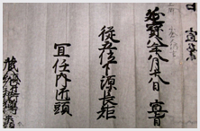 「若狭野浅野家資料」のうちで注目すべき古文書の一つに赤穂浅野家4代の口宣案があります。口宣案とは、大名が朝廷から官位官職を受けた際に、幕府 経由で発給された文書の一つです。大名の身分に関わる重要な文書で、どの大名家でも大切に保管していました。江戸時代前期に改易された大名家の口宣案が伝 来することは珍しく、たいへん貴重な古文書です。この口宣案を中心として、浅野家4代の事跡を展示します。