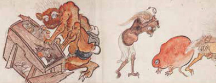 中世になると、いよいよ妖怪が造形化され、絵巻物の中で大あばれする。妖怪絵巻の代表作が次々と登場する。