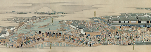 1805年(文化2)頃の日本橋通りを東側から俯瞰する構図で描いた、長さおよそ12mの絵巻です。通りに立ち並ぶ多くの店舗と、そこを行き交う1671人におよぶ人物が活き活きと描かれ、当時の江戸・日本橋の賑わいを一望することができます。この絵巻は1999年(平成11)にドイツで存在が確認され、2003年(平成15)に開催した当館の「大江戸八百八町展」にて日本初公開となり、大きな話題を呼びました。今回は三度目の里帰りで、日本での公開は11年振りとなります。