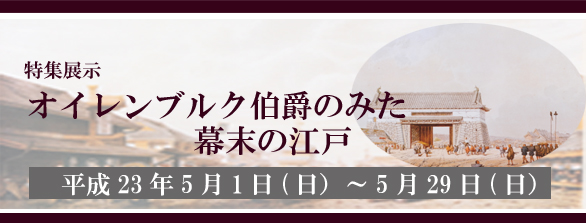 2011年は、日本とドイツの友好関係の原点となった日普修好通商条約が締結されて150年の節目の年にあたります。これを記念して江戸東京博物館では、ドイツ大使館の協力をえて、日独交流150周年記念パネル展「オイレンブルク伯爵のみた幕末の江戸」を開催する運びとなりました。 オイレンブルク伯爵は、プロイセン政府から通商条約の締結のため、 1860 年に日本をはじめとする東アジア諸国に派遣された外交官です。 プロイセン政府は、この時の公式記録を『公式資料によるプロイセンの東アジア遠征』として出版しましたが、その後も自然科学者マルテンスの動・植物編、画家ベルクによる東アジア諸国の風景画集を次々と刊行しました。この遠征に公式画家として随行したベルク(1825-84)は、江戸、長崎を中心とする幕末日本の風景を計 30 枚描いていますが、今回のパネル展では、そのうちの江戸・横浜を描いたパネルを中心に展示いたします。「横浜神奈川からの富士山の眺望」、「江戸城の城壁と北門(筋違橋付近)」、「江戸 日本橋付近」など、各地の特徴を的確にとらえた筆致は息を呑むほどの美しさに満ちています。これを機に郷愁を誘う 日本の原風景をお楽しみいただければ幸いです。
