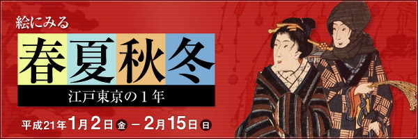 江戸の人々は、春夏秋冬という季節の変化に敏感であり、1年間の生活の節目となる年中行事をとても大切にしていました。 そのため季節の風物や、その季節を代表するような名所を描いた絵がたくさん生まれました。そしてそれらの絵の多くは、1月から12月までの12点揃、春夏秋冬の4点揃、あるいは長い絵巻に月毎の場面を順番に描くなど、点数の多い揃物や大きな画面によって制作されました。 これまで当館では、これらの作品を展示する場合、季節に合う作品や場面を選んで公開してまいりましたが、今回、年の始めのこの時期に、春夏秋冬の作品・場面を一挙に展示する機会をもうけました。 江戸東京の、1年間の暮らしぶりや風景を伝える当館所蔵の絵画作品を通じて、四季折々の行事や名所が時代とともに変わっていく様子、その一方で近代に至っても変わらず大事にされてきた十二ケ月の季節感など、四季に恵まれた江戸東京の文化や暮らしというものを改めて実感していただきたいと思います。
