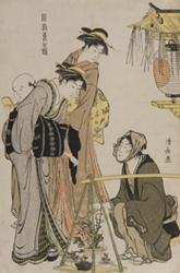 園芸植物への需要の増加と植木鉢の普及は、植木鉢に入れた草花の商品化を促していきました。植木鉢を担ぎ売りする商人は、生産者が販売も兼ねる場合、植木屋から仕入れて販売する場合がありました。販売する場は、縁日での露地売りから、移動しながらの振り売りまで多様でした。商品となった植物のなかでも、福寿草や梅は、新春を寿ぐ新たな贈り物として人気を博しました。また縁日では季節ごとに植木鉢に植えられた草花が売りだされ、その様子は四季の風物詩として多くの絵に描き込まれています。