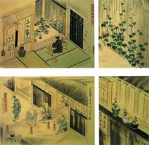手軽に持ち運べるようになった植木鉢が普及し始めると、人びとの生活空間にも変化が見られるようになりました。美しい花を咲かせる草花によって室内が彩られるようになり、庭にも植木鉢が並び置かれた棚がみられるようになっていきます。ここでは生活が園芸植物によって豊かに彩られるようになっていった様子を紹介します。