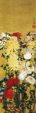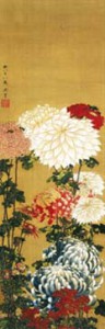江戸近郊において菊花興行が盛んに行われていた弘化4年、88才の葛飾北斎が描いた本作品は、発展した菊の品種改良の有様を如実に伝えてくる。