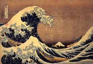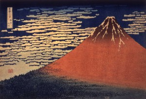 浮世絵の版画は、墨摺絵と呼ばれる白黒のものにはじまり、丹絵、紅絵、漆絵など次第に着色され、多色摺が完成しました。これが錦絵です。北斎の錦絵としての代表作が「冨嶽三十六景」シリーズです。斬新な構図や従来の藍よりも発色性の強いベロリン藍による彩色の美しさで人気が高く、北斎の風景版画家としての顔を確立しました。