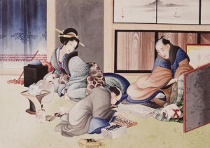 名披露目や演劇の案内など、私的な配り物として作られた非売品の木版画をいいます。天明年間(1781~89)に狂歌が一大流行したことに伴い、狂歌師の注文による摺物が増加しました。その多くが私家版のため、高級な紙を使い精緻な技巧が施されています。