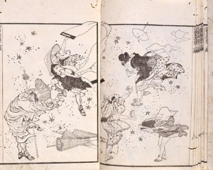 絵を学ぶ際に用いる教材を絵手本といいます。元々は、師から弟子へと肉筆画で伝えられていましたが、北斎は、大量に摺り版本として集約し、刊行しました。これが、北斎の代表作として有名な<北斎漫画>です。北斎は、肉筆画で絵手本を渡すには、弟子の数があまりに多過ぎたこと、全国の北斎ファンや私淑者や北斎の図案を求める職人など市場のニーズを意識して制作しました。<北斎漫画>の「漫画」とは、現在、使用されているカリカチュアを意味するものではなく、「北斎が気の向くままに描きまとめたスケッチ画集」を意味します。
