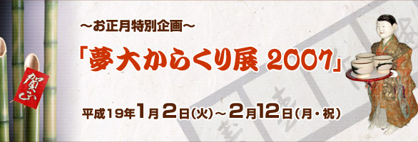 このことを記念し、江戸東京博物館では、日本からくり研究会との共催で、2007年のお正月に「夢大からくり展 2007」を開催します。 あらためて、江戸時代の日本の技術力、独創性を再認識していただくと同時に、土、日、祝日に開催される実演では、「からくり」の見事な動きをお楽しみいただければと存じます。