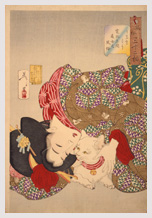 コケティッシュ な仕草をみせる猫は、女性を想定させ、猫と戯れる美人の図は、浮世絵で度々取り上げられました。江戸後期になると歌川国芳をはじめとして猫の姿そのものを 主人公にし擬人化した作品が登場します。以後彼の弟子による玩具絵などに猫が数多く描かれました。ここでは浮世絵に表現された猫たちをご紹介します。