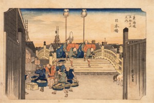 江戸と京都を結ぶ東海道の、53の宿場に江戸と京都の風景を加えた55枚揃のうちのひとつ。中央に日本橋を描き、東海道の長い旅路の幕開けを伝えるかのように、画面左右に開いた木戸を配した構図が劇的な効果を高めている。