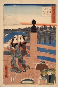 季節感を添えて江戸名所を描いた12枚揃のひとつ。旧暦4月の風物詩である初鰹とともに日本橋を描いたもの。擬宝珠のある柱と二人の女性の立ち姿がすっきりと印象 的で、日本橋を舞台とした美人画としても楽しめる作品。