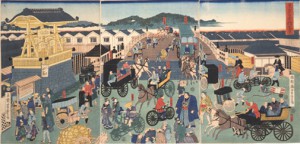 日本橋の高札場があるが、その横に「人力車」の営業所のようなものが見える。この作品は人力車の営業許可が下りた年のもので、絵師の空想も含まれているであろうが、人力車や馬車、自転車など、さまざまな乗り物が描かれていておもしろい。