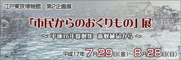 江戸東京博物館には、毎年多くのみなさまから資料寄贈のお申し出があります。平成16年度は、59名の方から6,644点の資料をご寄贈いただきました。この新収蔵品展は、寄贈者のみなさまへの感謝の気持ちをあらわすとともに、当館の資料収集の実際を広くご覧いただき、博物館活動への理解を深めていただくことを目的に開催します。