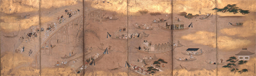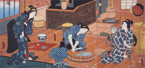 江戸は、前方に海が広がり、川や水路が流れる水の豊かな都市でした。江戸前の海の幸は、グルメな江戸ッ子たちの自慢です。人びとは初鰹の便りを心待ちにし、新鮮な白魚に舌鼓を打ちました。江戸を代表する河川である隅田川は、庶民のレジャースポットとして昔も今も大人気です。川のほとりの風光明媚な名所には、四季おりおりに大勢の人が集い、両国の盛り場では見世物や相撲の興行が行なわれました。この章では、絵画を中心に、江戸で花開いた暮らしの文化のさまざまな姿をご紹介します。