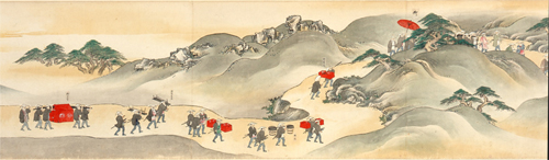 将軍や姫君の旅行は、大勢の随行人や荷物を従えて華やかな行列が仕立てられました。これに比べて、庶民の旅は身軽なものです。日本各地のガイドブックを兼ねた本がベストセラーになりました。明治時代になると、若者たちが西洋の知識を求めてはるかな海を渡りました。交通網が発達した大正時代には修学旅行が盛んになり、旅行に参加した生徒が宝物のように大切な旅の思い出を綴りました。この章では旅をテーマにし、興味深い資料をご覧いただきます。