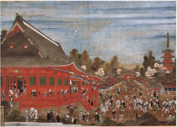 一つは、歌川豊春筆の肉筆画の大作「浅草寺図」です。作者の歌川豊春は、遠近感を強調して浮き出てくるように見える「浮絵」を得意としました。この作品には、多くの参詣人にまじって鳩や鶏・コウノトリなど多種多様な鳥たちが描かれています。