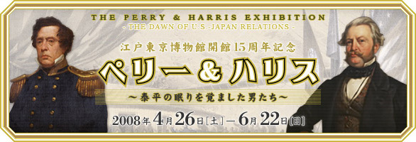 1858年(安政5)、米艦ポーハタン号上で日米修好通商条約が結ばれ、ここから日本とアメリカは本格的な通商を開始しました。ペリー来航に始まり日米和親条約締結、そして日米修好通商条約に至る一連の推移は近代日本を方向づけた日本史上の大事件と言えるでしょう。 2008年(平成20)は、この日米修好通商条約締結から150年にあたります。本展では、米海軍提督ペリーと初代駐日米国総領事ハリスに焦点を あて、国内外約250点の資料で幕末の対外関係をわかりやすく紹介します。展覧された方に、日本とアメリカの歴史、風土、文化を相互に理解していただけれ ばと考えています。 展示資料は、ペリーとハリスの遺品を中心に、ペリー艦隊の同行画家ハイネが描いた油絵原画、日米和親条約と日米修好通商条約の原本、幕府の贈答品―に至るまで、日本で初めて公開されるものばかりです。 本展は、「日米外交の原点」、「ペリー、ハリスと幕府の攻防」、「幕末日本の情景と美術」などを実感する、またとない展覧会です。