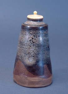 薩摩焼は 1601 年(慶長6)に 開窯(かいよう)しました。九州の諸窯と同様に、茶道界の新しい茶道具を求めてやまない時流に乗ったと考えられます。渡来した朝鮮陶工たちは、日本人の好みを学ぶために陶業の先進地に出向き修行しました。しかし、初期の薩摩焼茶道具は生産技術が未熟であったために生産量が極めて少なく、現存する作品は希少なものとなりました。 現在、薩摩焼茶陶で残っているものの多くは、 肩衝(かたつき)、 文琳(ぶんりん)、茄子(なす)、 丸壺(まるつぼ)などの茶入で、これに次ぐのが茶碗です。薩摩焼茶道具は、その姿、形と釉薬をたっぷり厚く掛けた重厚さが魅力です。