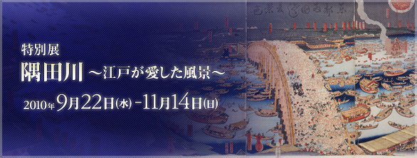 隅田川は、江戸の人々にとって輸送の大動脈であると同時に、江戸の名所として、あるいは江戸の名所を数多く抱えた川として深く愛され、親しまれてきた川です。そのため隅田川や、隅田川周辺にある数々の名所は、江戸時代を通じて無数の絵に描かれてきました。当館でも、開館前より隅田川に関する絵については錦絵や屏風、絵巻などを収集してきており、ひとつのコレクションとなりました。 この展覧会は、当館が20年以上をかけて収集してきた隅田川の絵を初めてまとまったかたちで一挙に公開するとともに、他に所蔵されている名品とあわせて、描かれた隅田川の多彩な世界をご覧いただくものです。そして描かれた隅田川を通じて、江戸の文化や生活の中に根ざした隅田川というものを再確認していきたいと思います。 隅田川の絵が、これほどの規模で集まるのは初めてのことになると思います。是非この機会に、都市江戸の 象徴のひとつである、隅田川の絵をご堪能下さい。