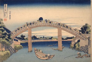 高い建物などなかった江戸時代、橋の上や舟の上から見晴らすと、遠景には富士山と筑波山を望み、近景には川岸の有名な社寺の建造物の姿が点在するのが眺められます。広々とした空間の中に描かれた隅田川は、都市江戸の山水画(さんすいが)と言えるかもしれません。