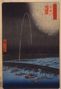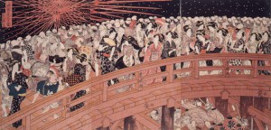 隅田川が描かれ始めたときから、舟遊びの描写は登場します。とりわけ三ツ俣(みつまた)(中洲)や両国橋界隈は舟を繰り出す人気の場所として知られており、この場所で月見や花火を楽しむ舟のようすを描いたものは多いです。
