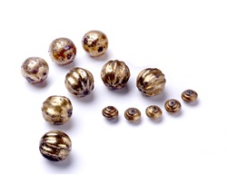 日本で玉が出現するのは旧石器時代末頃のことです。当初は動物の牙や骨を素材にしていましたが、縄文時代末頃にはヒスイを加工した美しい石製の玉が作られるようになります。弥生時代になると、ガラスをはじめ多彩な材料の玉が現れ、有力者の墓に収める風習が始まります。