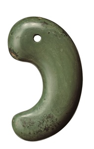 頭が大きく尾が細いC字型の勾玉。このユニークなかたちは、世界の宝飾品の歴史の中でもほとんど類例がありません。中国の玉にも見当たりません。古代の日本人がなぜこの形を好んだのかは、諸説あります。縄文時代には動物の牙や骨を素材にした玉が盛んに作られます。実は、玉の代表格である勾玉の形は、縄文時代に誕生した牙玉がルーツという説が有力です。