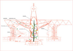 独立行政法人日本万国博覧会記念機構所蔵 高さ70mの太陽の塔は、空中(未来)、地上(現代)、地下(生命)の三層で音と光とモニュメントによる展示が行われ、塔中心部には「生命の樹」が空間を貫いた。また、塔内のエスカレーターと横に広げた腕が空中ゾーンへの交通手段にもなっていた。