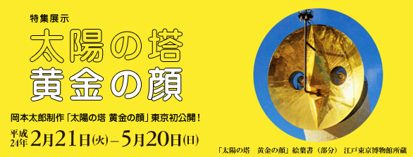1970年(昭和45)、大阪で開催された日本万国博覧会(以下万博)のテーマ館のシンボルとして太陽の塔が建造されました。日本を代表する芸術家の一人である岡本太郎の制作によるもので、博覧会終了後も万博公園に残されました。直径11mをはかる黄金の顔は未来を表し、太陽の塔の上部に設置されました。万博会期中は両目にキセノン灯光器を設置して点灯し、来場者の人気を集めました。 1992年、改修のために取り外した黄金の顔(独立行政法人日本万国博覧会記念機構所蔵)を、当館特別展「ザ・タワー ~都市と塔のものがたり~」開催にあわせて、当館常設展示室内に展示します。東京では初公開となります。また、東京ゾーン「よみがえる東京」のコーナーでは、戦後復興の象徴となった東京オリンピックを経て開催された「世紀の祭典」としての万博とその時代を関連資料によりふりかえります。