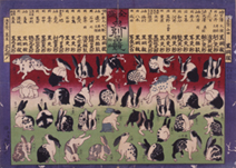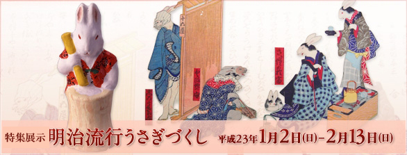 平成23年の干支・卯年にちなんで、特集展示「明治流行うさぎづくし」を開催します。明治の初め頃、東京ではたいへんなうさぎブームが起こりました。もてはやされたのは白地に黒の斑点の、「黒更紗」と呼ばれたうさぎたち。明治の人びとはこの珍奇なうさぎに熱中し、唄や絵の中にその足跡を残しました。 擬人化されたうさぎたちが世情を示す「兎絵」を筆頭に、江戸時代の工芸品や絵本から、日本のうさぎ観と明治の大流行に迫ります。愉快でかわいらしいうさぎたちに会いに来ませんか?