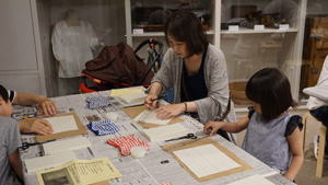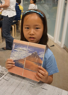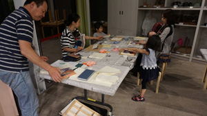 最後は、金色の紙片が5種類配られ、「高価な順に並べてみよう」とのことで、それぞれ金の紙片をじっくり観察。本物の金箔がのっている紙から、折り紙に使われる、アルミニウムなどを加工して作るものまでさまざま。完成した屏風と5枚の金の紙片もお持ち帰りいただき、参加したお客様は大満足!和気あいあいのワークショップでした。