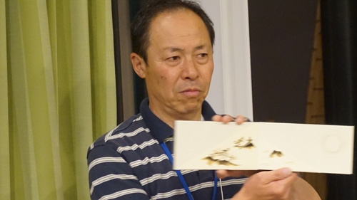 屏風の形が完成したら、からくり屏風の4面のうち1面に北斎の赤富士を貼ります。昔ながらのお米からつくるヤマトノリは、とくに夏場は管理が悪いとすぐかびてしまうので、管理がたいへんだそうです。