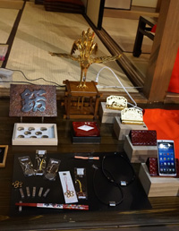 お神輿の上に乗る鳳凰が立派でしたが、お神輿の金具風のスマホ置き、アクセサリーなど、伝統の技を現代に応用した工芸品が並び、お客様も思わず身を乗り出して、熱心に見ていらっしゃいました。