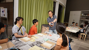 そして、この日ミュージアム・ラボでは、片岡恭一さんによる「からくり屏風をつくってみよう」というワークショップを行いました。片岡さんが丁寧に説明されて、屏風の基礎つくりが着々と行われていきます。